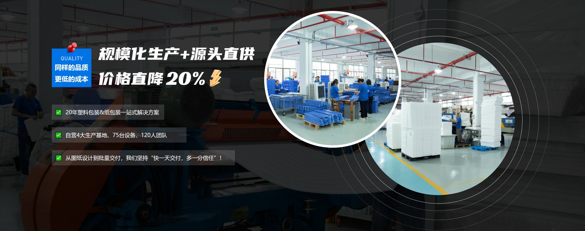 深耕包裝行業(yè)20年,依托蘇州、吳江、南通自有生產(chǎn)基地(總面積超16650㎡),構(gòu)建了從原料采購(gòu)到成品交付的全鏈條控制體系。我們拒絕代工貼牌,所有產(chǎn)品均由自有工廠(chǎng)生產(chǎn),75臺(tái)進(jìn)口設(shè)備全年無(wú)休運(yùn)轉(zhuǎn),確保日產(chǎn)能超10萬(wàn)件,規(guī)?;?yīng)讓客戶(hù)享受“工廠(chǎng)價(jià)即批發(fā)價(jià)”的直供優(yōu)勢(shì)。